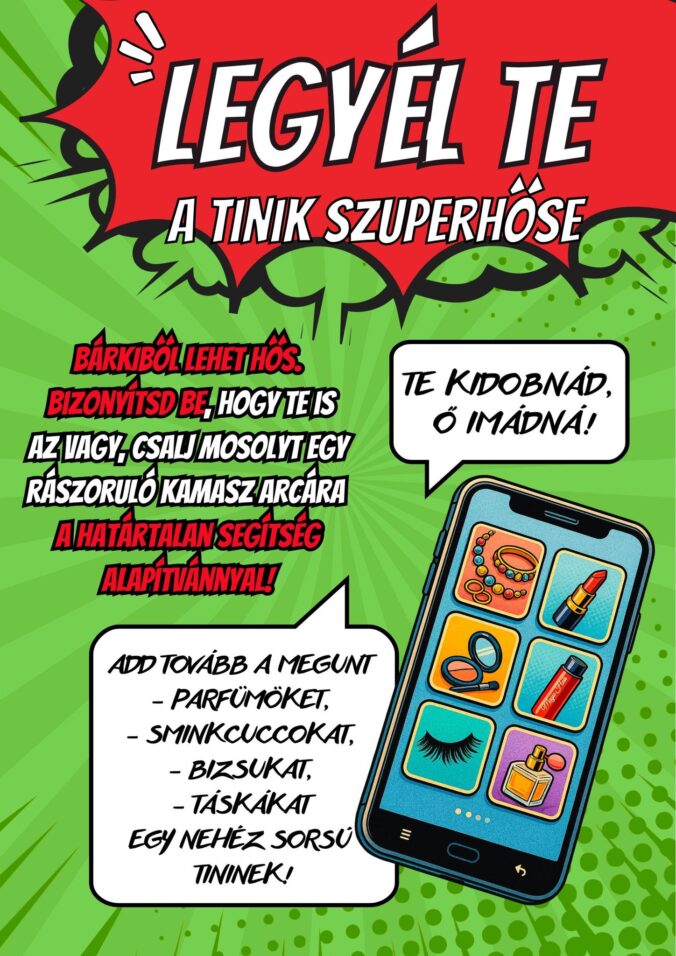 Észrevettük, hogy az árva, nevelőotthonban élő, rászoruló kamaszok az illatszereknek, kozmetikumoknak, ékszereknek örülnek a legjobban. Imádják a parfümöket, sminkkészleteket, rúzsokat, körömlakkokat, bizsukat, táskákat, ezért arra kérünk titeket, hogy tegyétek dobozba a tévedésből vásárolt, ajándékba kapott, de nem tetsző, új vagy már felbontott parfümöket, a megunt táskákat, bizsukat, öveket, és juttassátok el nekünk! A sminkekből, kozmetikai termékekből, krémekből és kencékből – higiéniai okokból – csak olyat fogadhatunk el, amit korábban még nem használtatok.